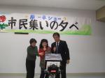 夜は「西川まさひと・ふるさと後援会」の役員懇親会に顔をだしました。約1ヶ月ぶりの再会でしたが、とても楽しく「美酒」をいただきました。末永く「選友(せんゆう)」としてお付き合いいただければと、挨拶させていただきました。 (写真:左、板井清春幹事長。中央、杉山正幸会長)