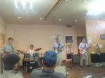 (写真:左から。パークゴルフ大会で「お天気とうまく付き合い思い出に残る大会に」とあいさつ。一番右が孫・太志くん。豊岡食べマルシェでは親父バンドが花を添えました。)
