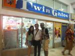 (写真:左・洋服屋さんの様子。中央・3人で買物。右・ボルト選手のお店の店員さん達)