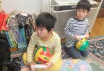 (写真:左・東光の山口辰一さん宅のお庭。右・次女、香菜からのお土産を大切にして遊ぶ孫)