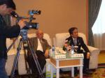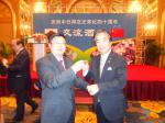 (写真:左/ハルピン市理事者との会談風景。右/歓迎交流酒宴で、張ハルピン市副市長と)