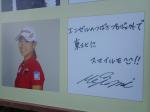 (写真;左/今日の大会スコアボード。右/エンゼルマーク運動を呼びかける木戸愛サイン。)
