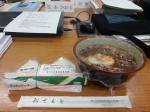 (写真:東旭川産の新米おにぎり。蕎麦は市役所地下食堂の出前。270円です)