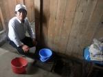(写真:豊岡市営住宅の地下物置の浸水を調査しました。住民はバケツでの排水作業に追われていました。)