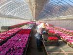(写真:東旭川町豊田の「花の二階堂」さんのハウス。シクラメンの赤・ピンク・白のコントラストは見事でした。清純の白を買い求めました)