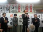 (写真:当選後、事務所でお礼のあいさつをする佐々木隆博さん)