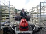 (写真:高倉伸淳さん宅で新型田植え機に乗せていただきました。ネクタイが似合わないです)